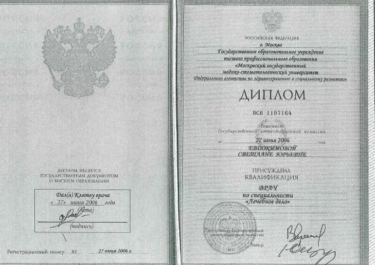 - 1999-2006: ГОУ ВПО «Московский Государственный Медико-Стоматологический Университет Федерального агентства по здравоохранению и социальному развитию», факультет «Лечебное дело»
