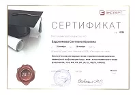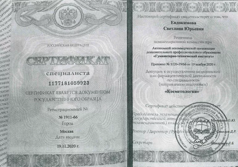 - 2017: ФГБОУ ДПО «Институт повышения квалификации Федерального Медико-Биологического агентства, «Косметология»