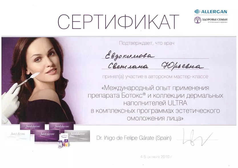 - 2008: Сертификат компании «Здоровье Семьи» «Allergan» на применение препарата Botox