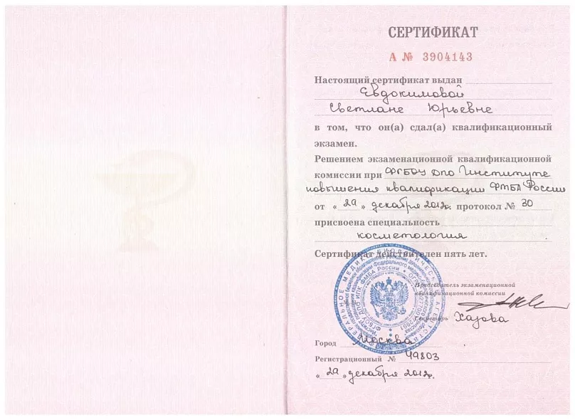 - 2012: «Институт повышения квалификации ФМБА России», отделение — косметология