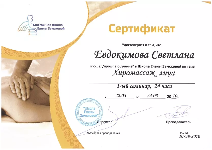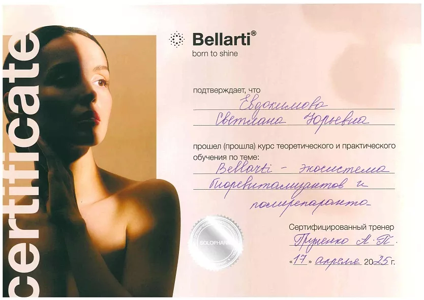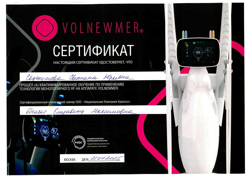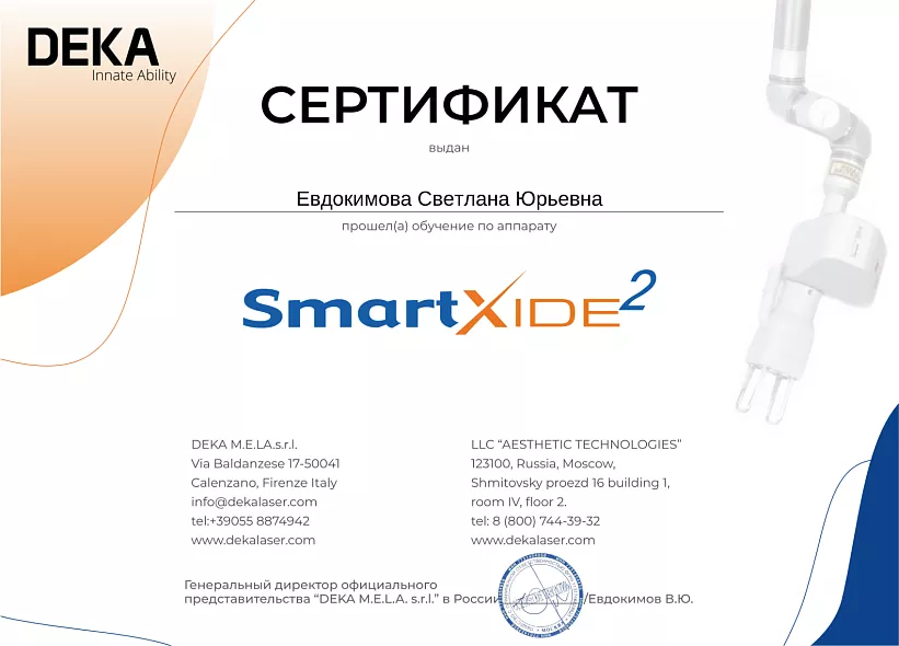 - 2016: МТ КОМед, методики работы с аппаратом Soprano XL, Alma Lasers