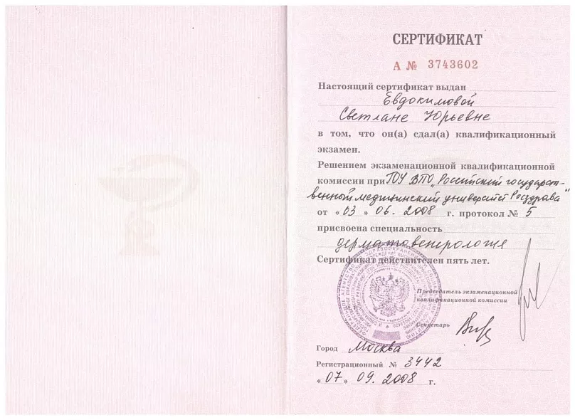 - 2018: ФГБОУ ДПО « Институт повышения квалификации Федерального Медико-Биологического агентства», дерматоонкология и дерматоскопия