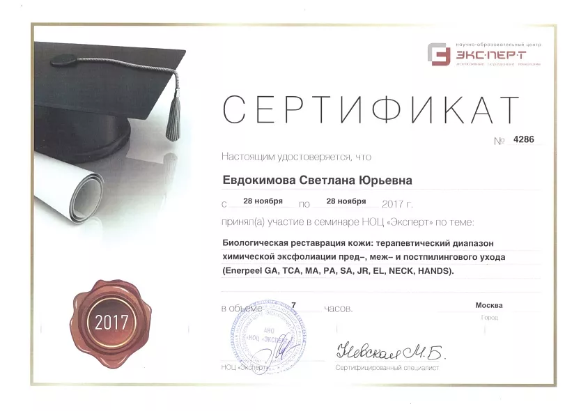 - 2017: НОЦ Эксперт, биологическая реставрация кожи: терапевтический диапазон химической эксфолиациии