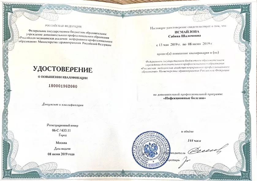 • 2019: «Инфекционные болезни» в объеме 144 часа, Российская медицинская академия непрерывного профессионального образования
