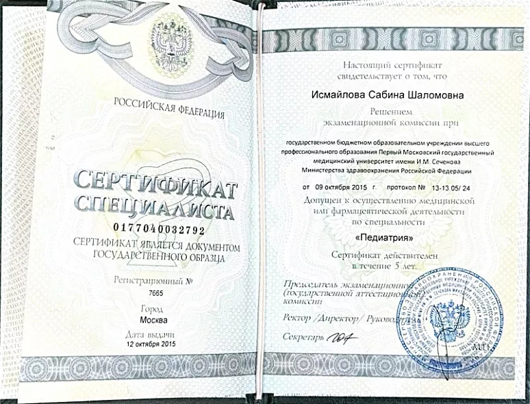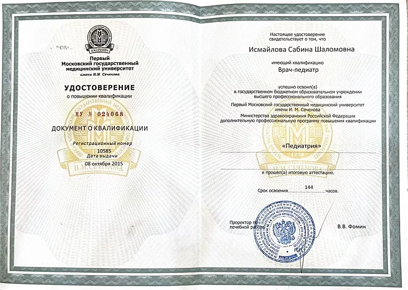 • 2010: «Педиатрия», в объеме 216 часов, Первый государственный медицинский институт имени Сеченова