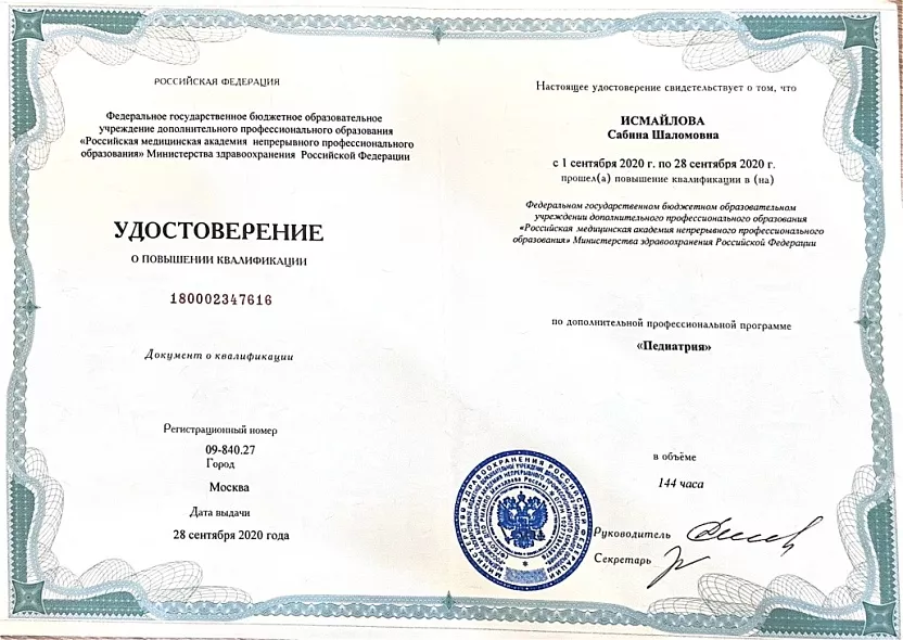 • 2005: «Педиатрия», в объеме 144 часов, Смоленский государственный медицинский университет