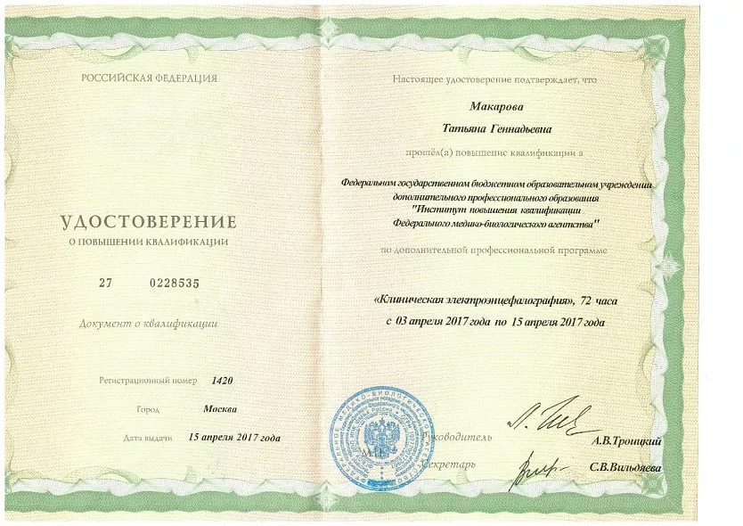 - 2017: ФГУ ФМБА, курс по Электроэнцефалографии