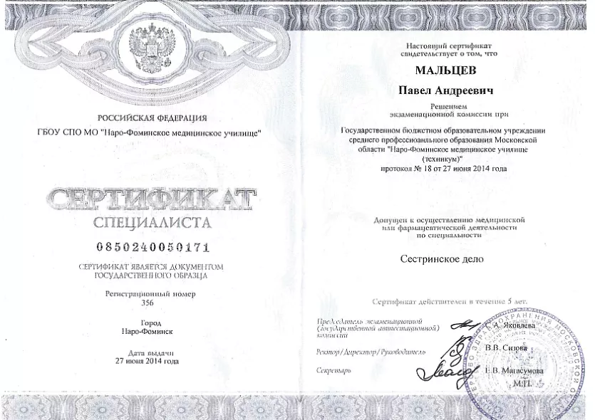 • 2014: Наро-Фоминский медицинский колледж по специальности сестринское дело
