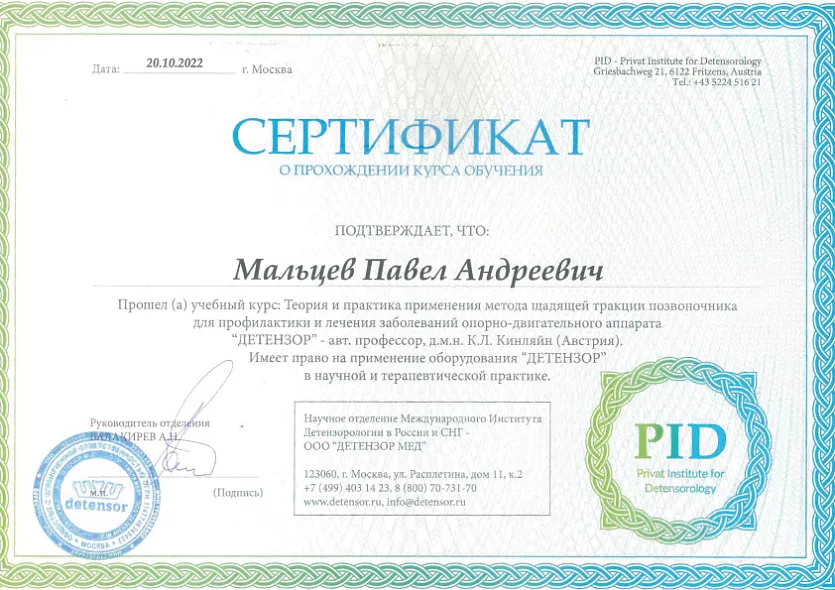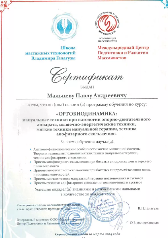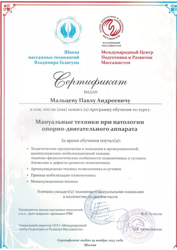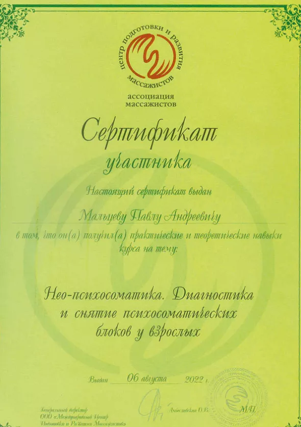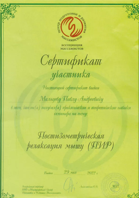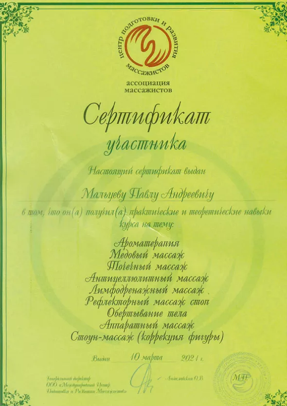 • 2020: сертификат «Медицинский массаж»