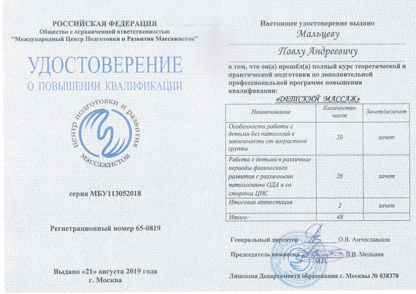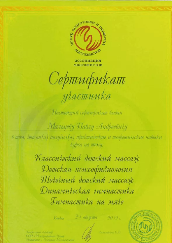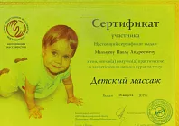 • 2019: «Детский массаж» повышение квалификации