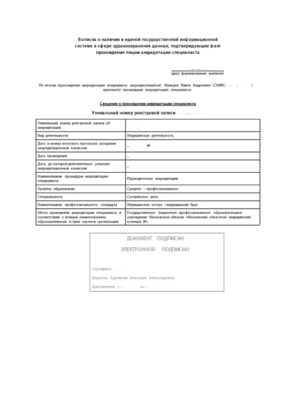 • 2019: сертификат «Сестринское дело»