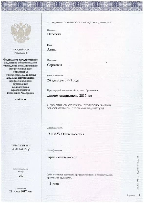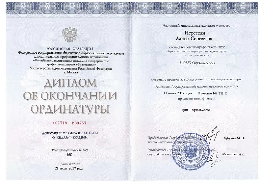 - 2017: Ординатура ФГБОУ ДПО Российская медицинская академия непрерывного профессионального образования МЗ РФ, Врач-офтальмолог