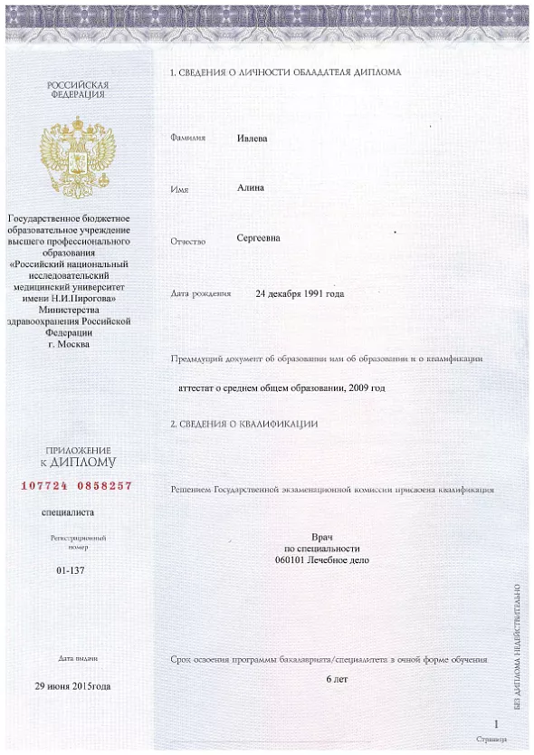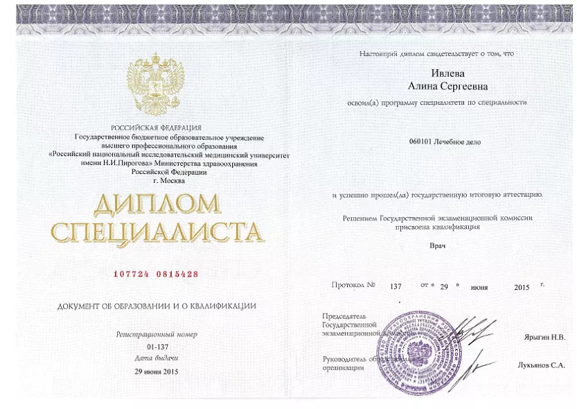 - 2015: Российский национальный исследовательский медицинский университет имени Н. И. Пирогова Минздрава России, Лечебное дело