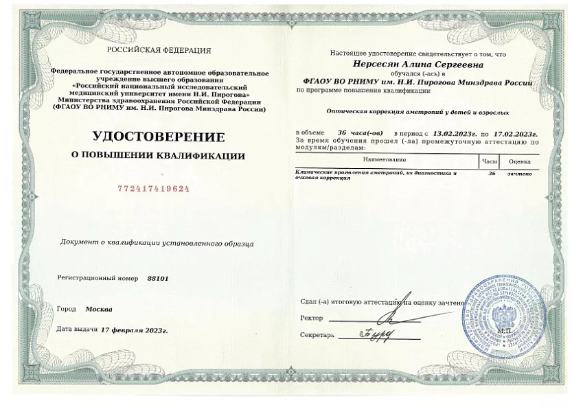 - 2023: Российский национальный исследовательский медицинский университет имени Н. И. Пирогова Повышение квалификации «Клинические проявления аметропий, их диагностика и очковая коррекция»