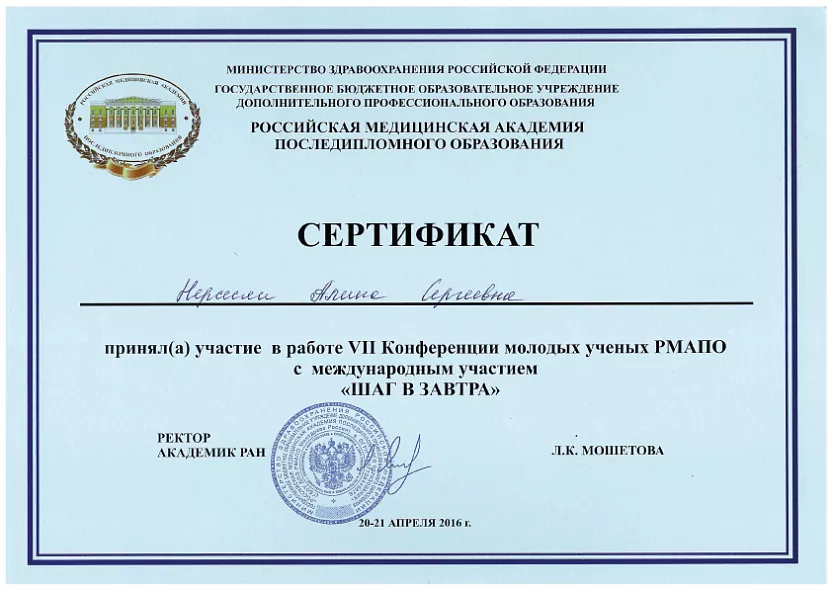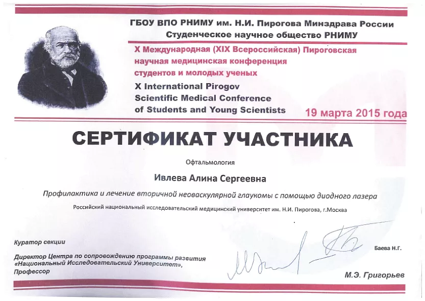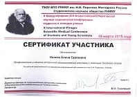 - Участник Международной (Всеросийской) Пироговской научной медицинской конференции студентов и молодых ученых