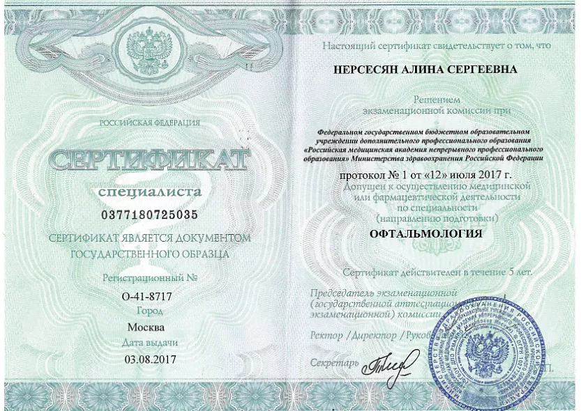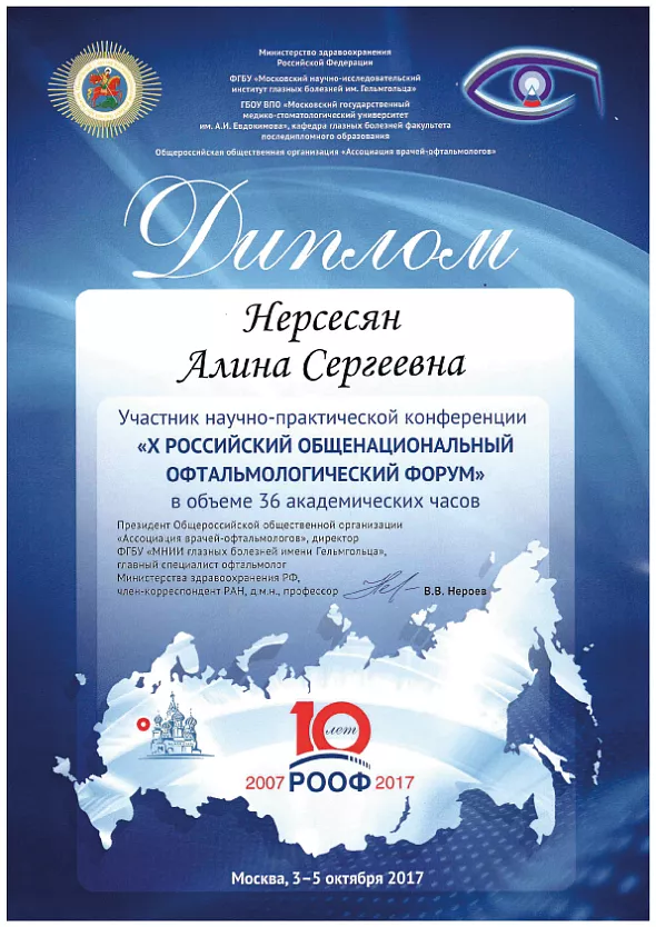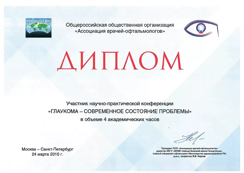 - 2021: ФГБОУ ДПО РМАНПО Периодическая аккредитация по специальности офтальмология
