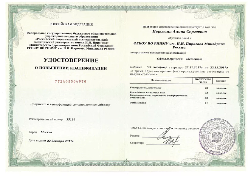 - 2017: Российский национальный исследовательский медицинский университет имени Н. И. Пирогова Повышение квалификации «Детская офтальмология»