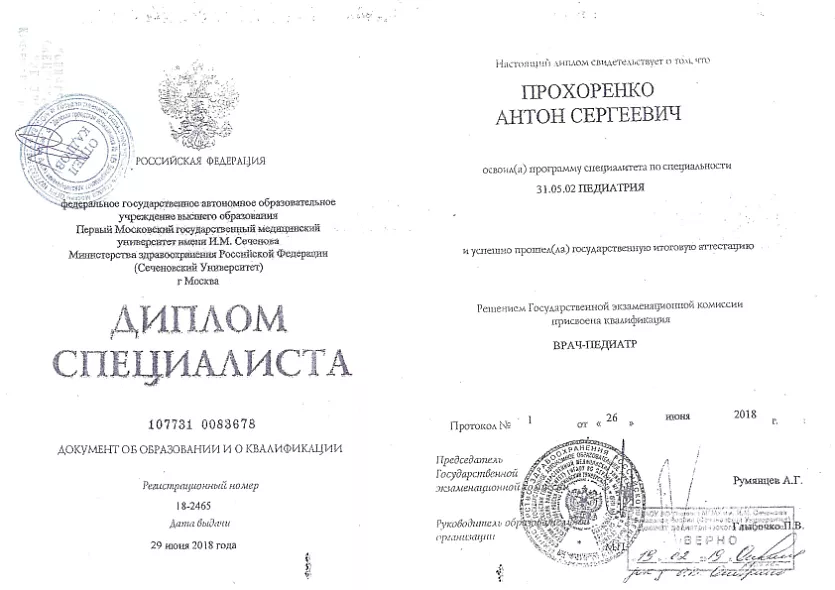 • 2018: ФГАОУ ВО Первый МГМУ им. И.М. Сеченова, Врач-педиатр участковый