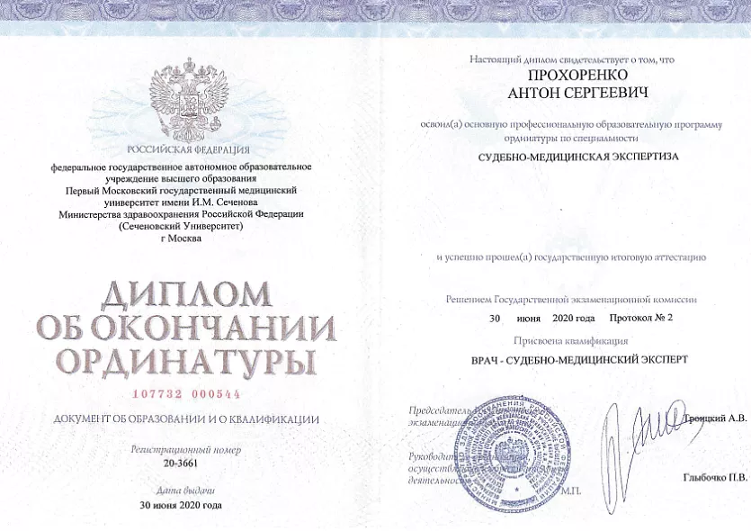 • 2020: ФГАОУ ВО Первый МГМУ им. И.М. Сеченова Врач судебно-медицинский эксперт