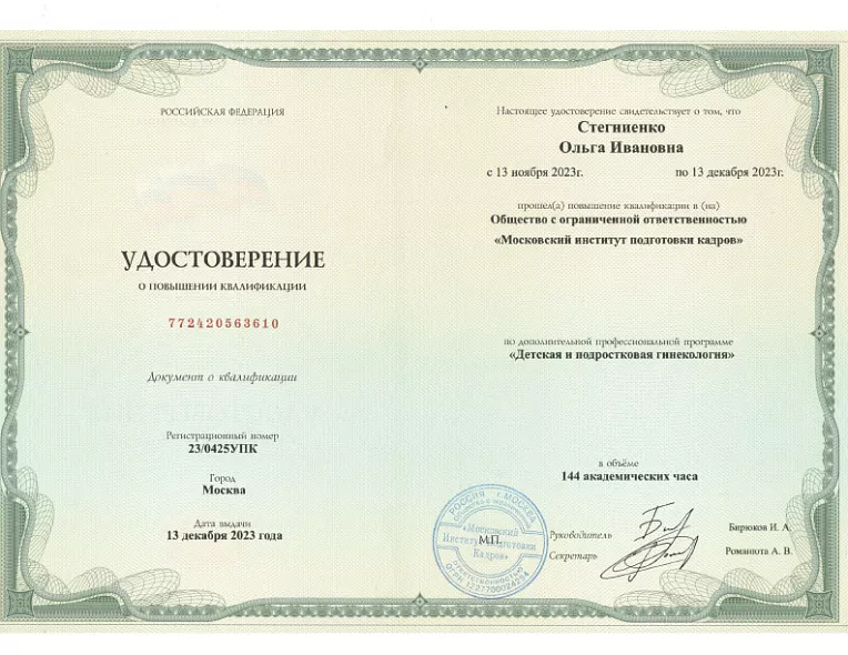 - 2021: АНО ДПО «Санкт-Петербургский университет ПК и ПП» «Нормативно-правовые аспекты работы врача акушера-гинеколога»