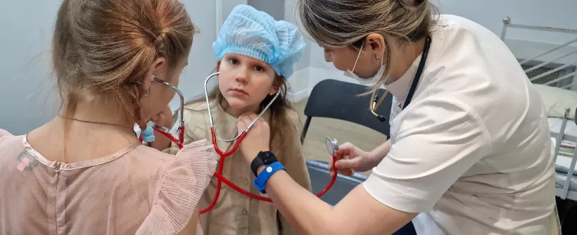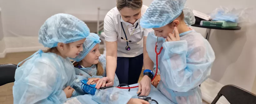 Чтобы детям было интереснее, в игровой форме они могли побывать и в роли врача, и в роли пациента: примерить медицинскую форму (шапочку, маску и халат), подержать в руках настоящие инструменты врача (фонендоскоп, отоскоп, стетоскоп и тонометр), измерить «пациенту» давление и пульс, осмотреть горло, нос или уши, «послушать» легкие, заполнить чек-лист здоровья и попробовать поставить диагноз.