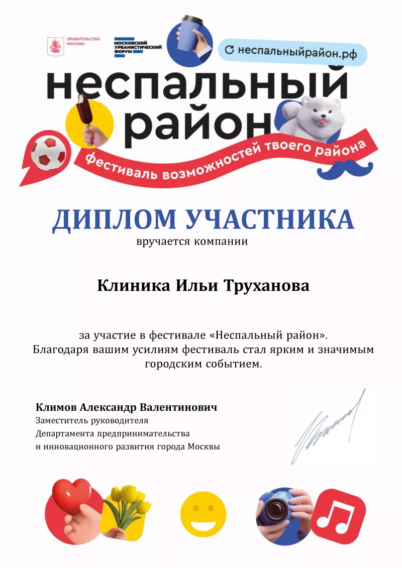 Такие наши инициативы получают поддержку и со стороны городских властей. За участие в мероприятиях фестиваля «Неспальный район», которые проходили с 5 августа по 3 сентября 2023 года, Клиника Ильи Труханова удостоилась специального Диплома от Департамента предпринимательства и инновационного развития города Москвы. Всегда рады быть полезными!