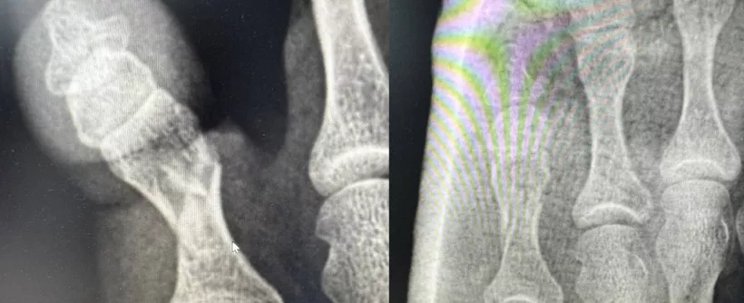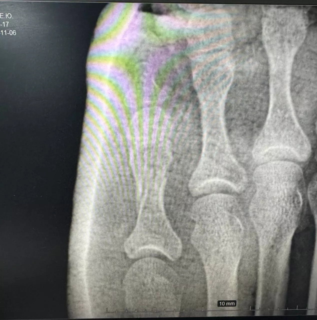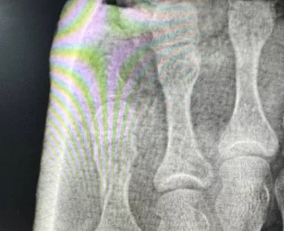 Осмотр и рентгенография позволили поставить диагноз — оскольчатый перелом проксимальной фаланги 5-го пальца. Иван Александрович выполнил репозицию (сопоставление) отломков кости и иммобилизацию стопы гипсовой лангетой. Контрольная рентгенограмма после процедуры позволила оценить результат и убедиться в восстановлении фрагментов. Пациентка довольная уехала домой.