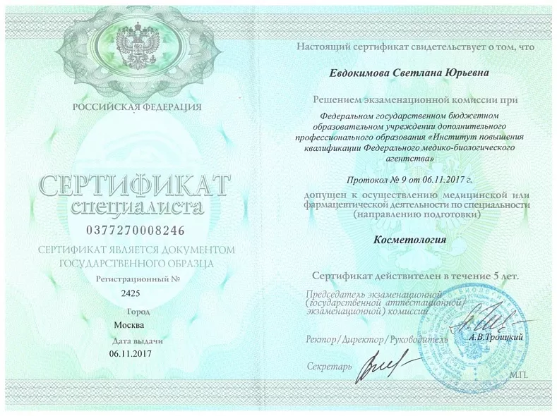 - 2012: «Институт повышения квалификации ФМБА России», отделение — косметология
