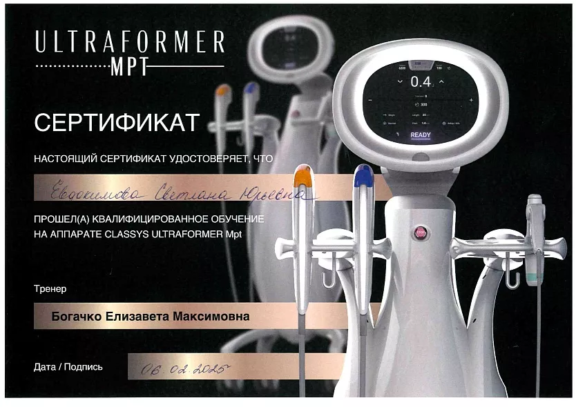 - 2016: Обучение работе на аппарате для УЗ SMAS лифтинга Ulthera system