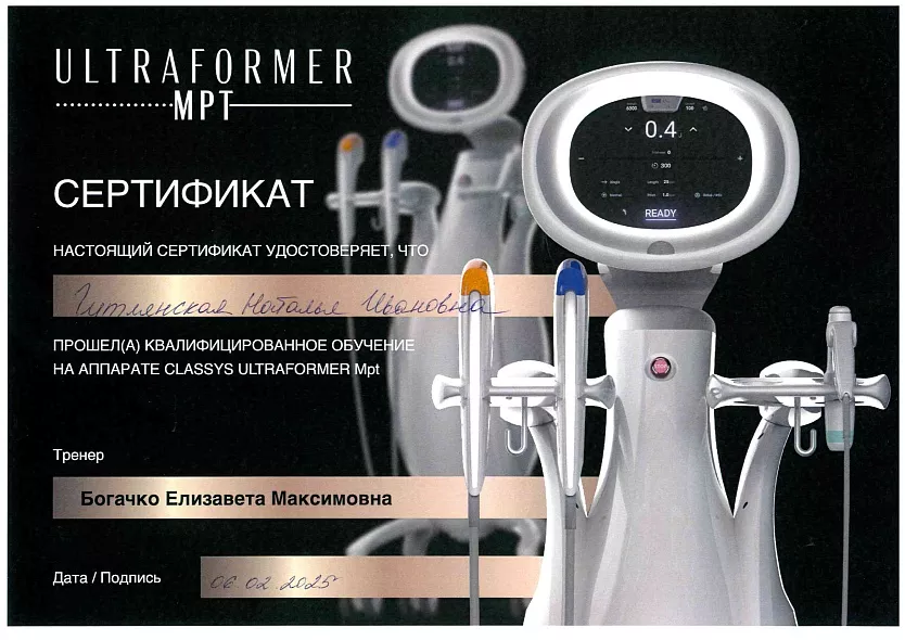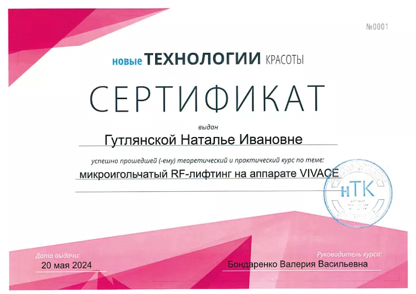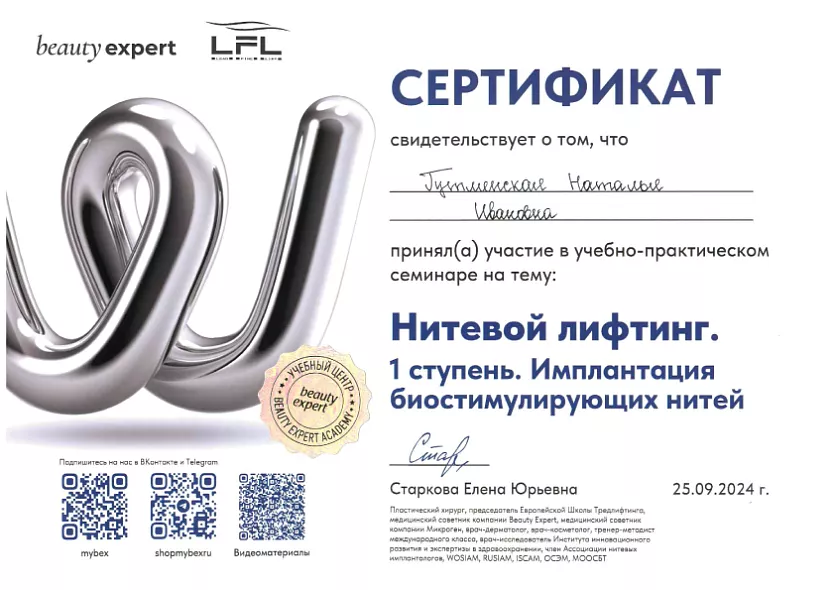 - 2017: Косметология, Российская медицинская академия непрерывного профессионального образования МЗ РФ