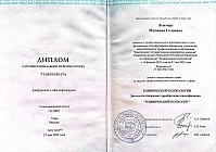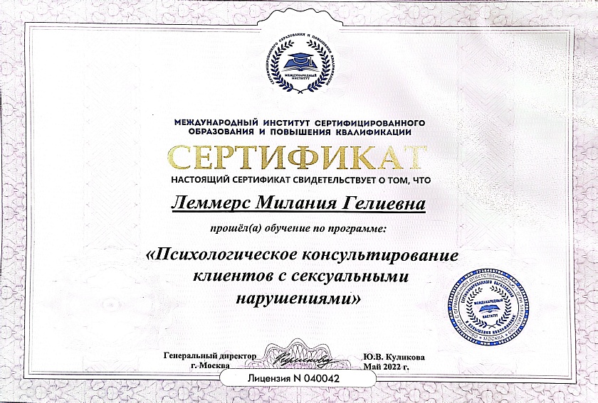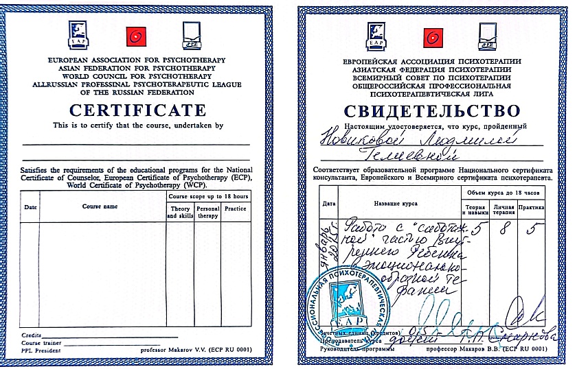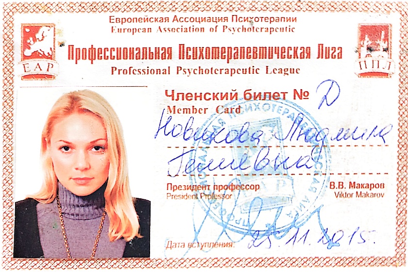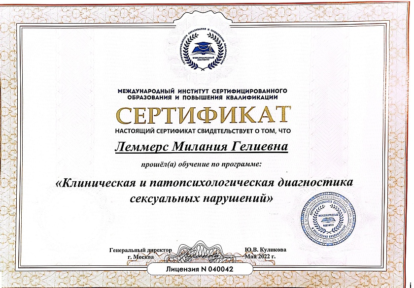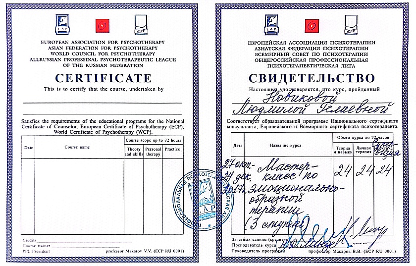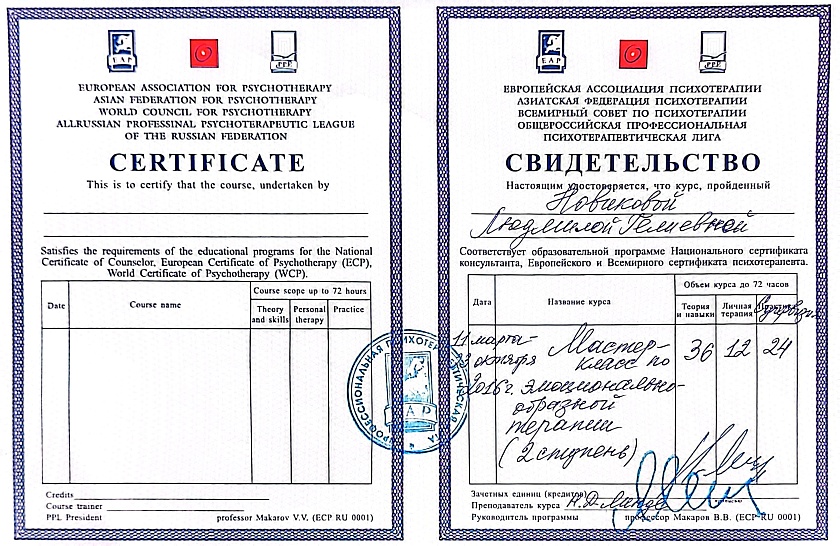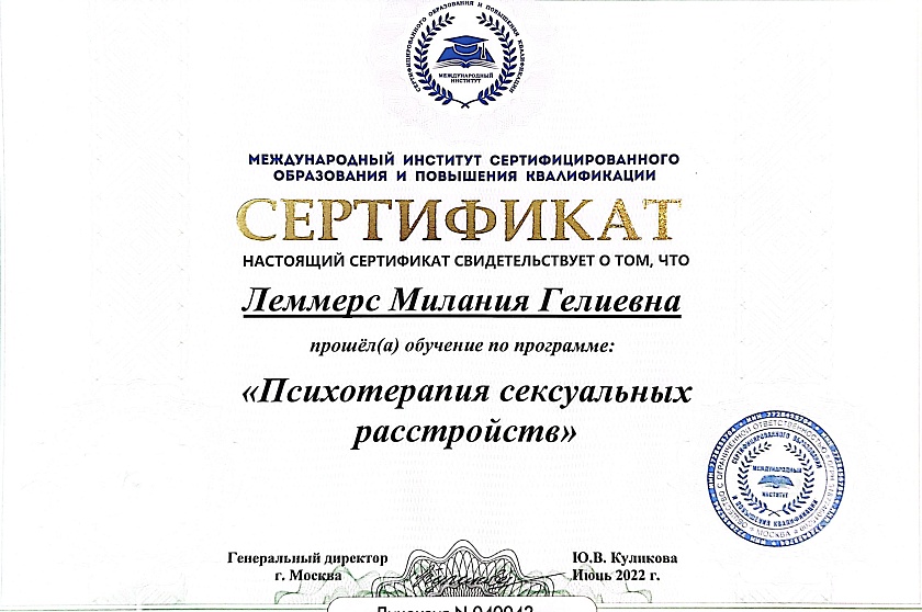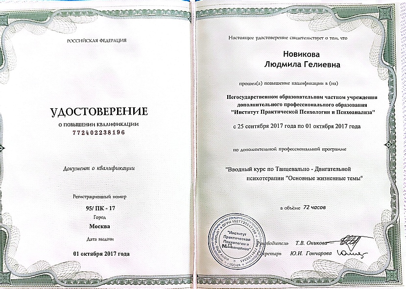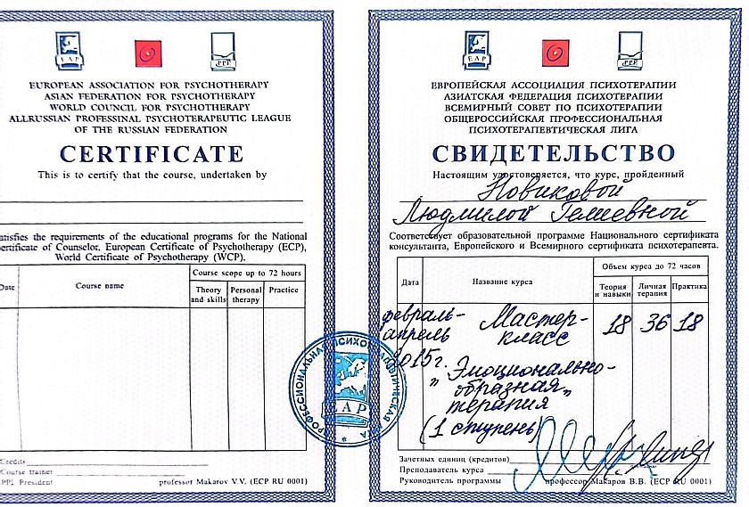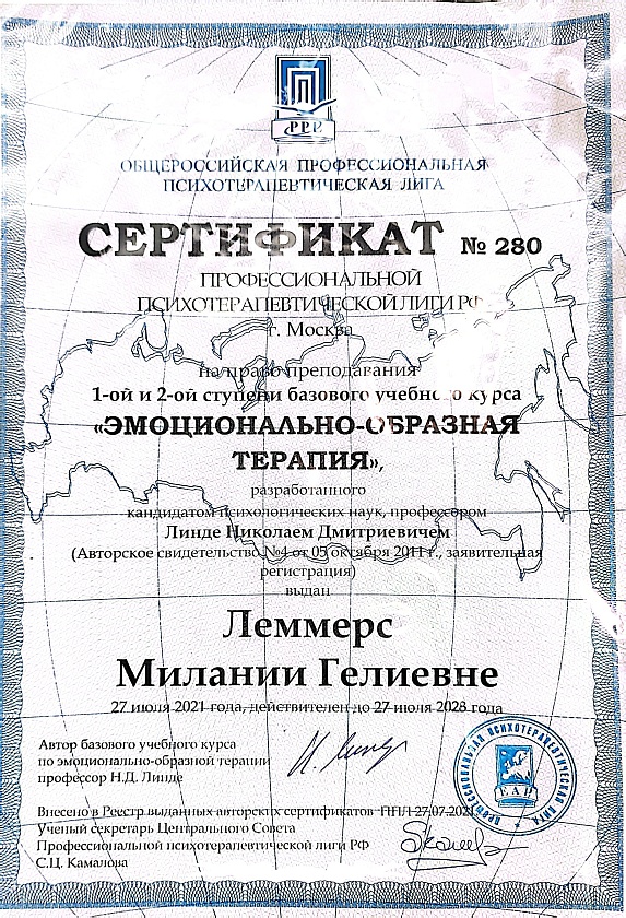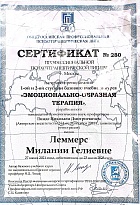 Специалист эмоционально-образной терапии, преподаватель эмоционально-образной терапии, гипнотерапевт, танце-двигательный терапевт, психотерапия сексуальный нарушений.