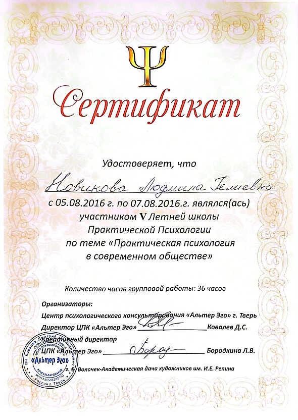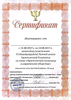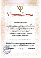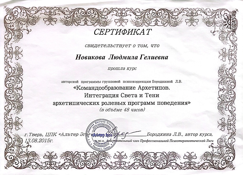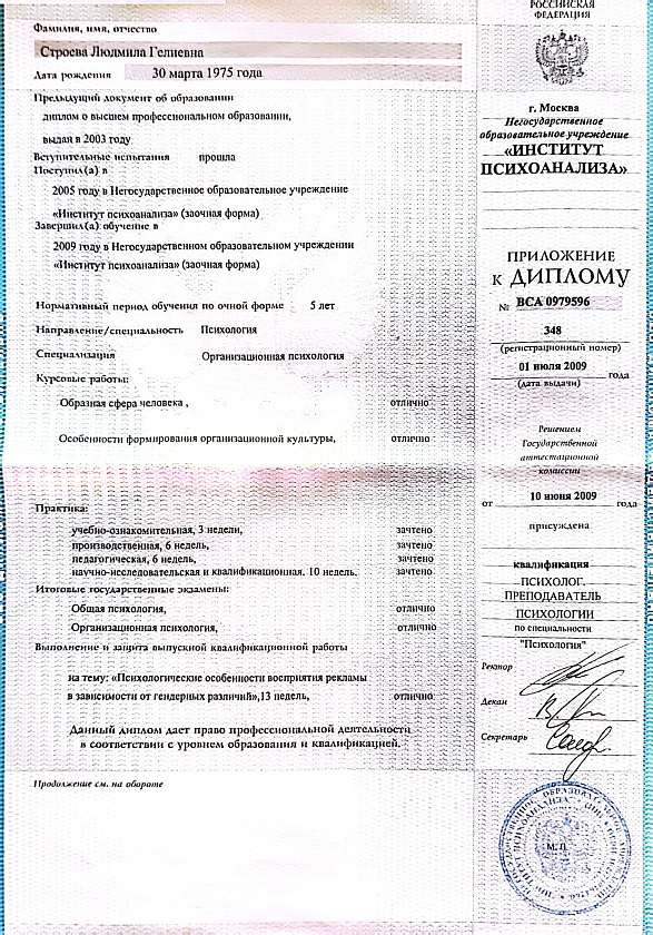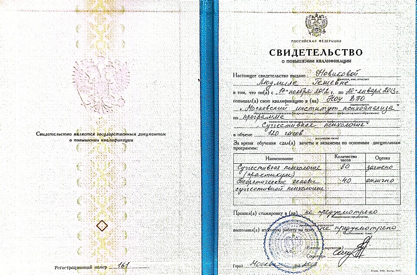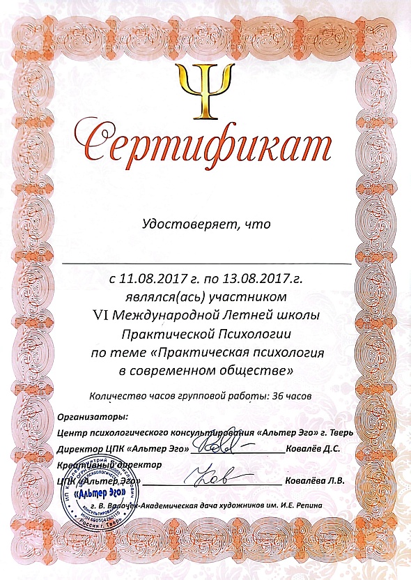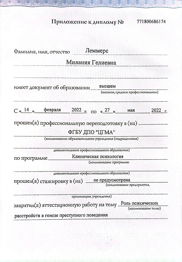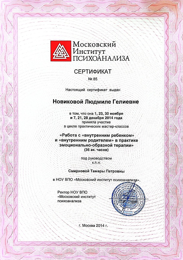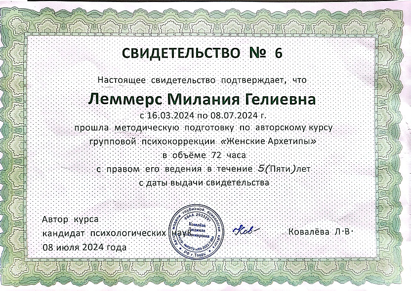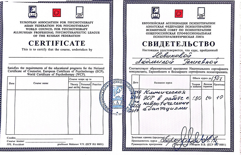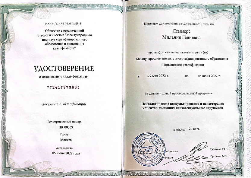 Специалист эмоционально-образной терапии, преподаватель эмоционально-образной терапии, гипнотерапевт, танце-двигательный терапевт, психотерапия сексуальный нарушений.
