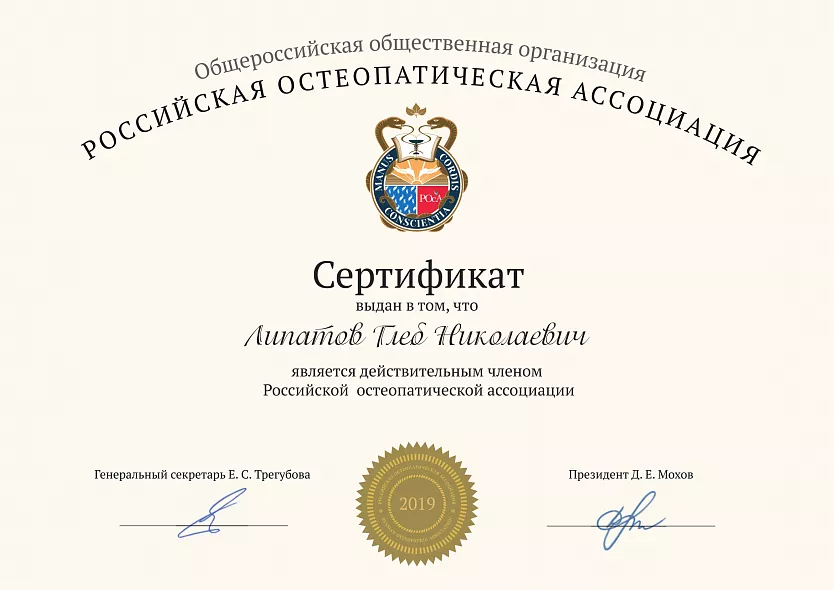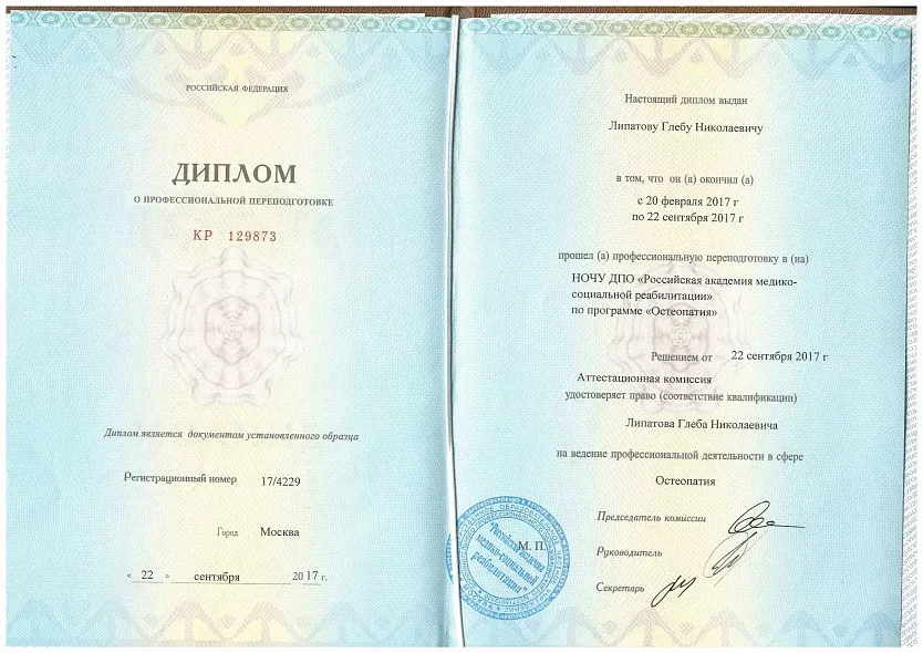 - 2017: Российская академия медико-социальной реабилитации, Остеопатия