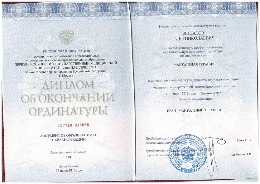 - 2014 – 2015: ординатура, Первый МГМУ им. И.М. Сеченова, Кафедра мануальной терапии