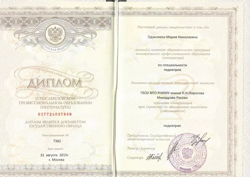 • 2015: Российский национальный исследовательский медицинский университет имени Н.И. Пирогова, Педиатрия, Интернатура