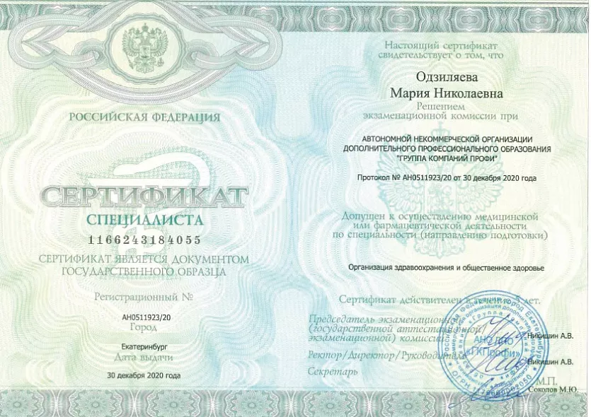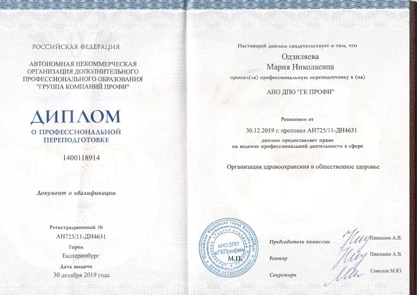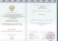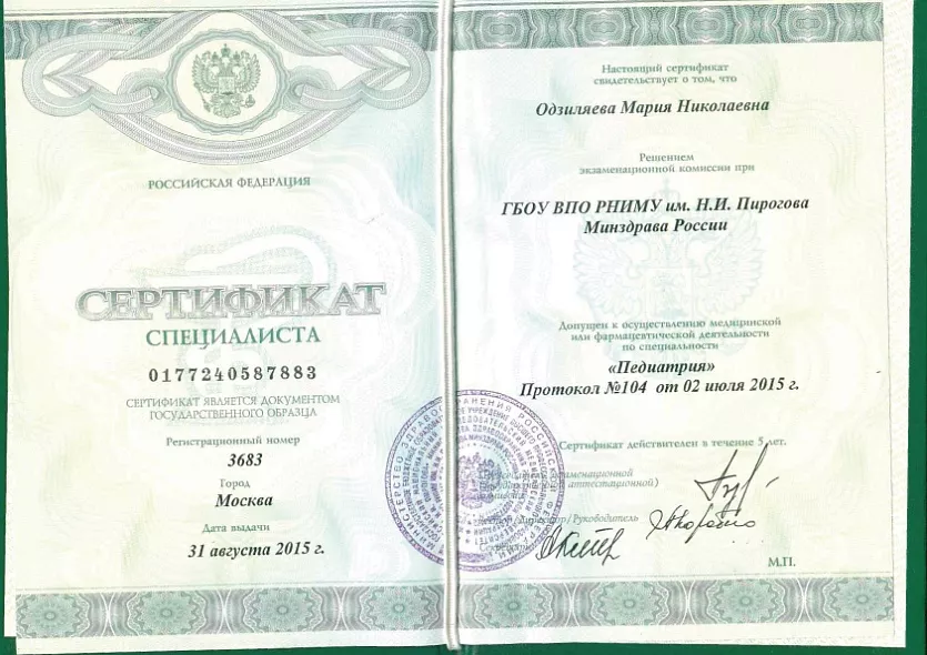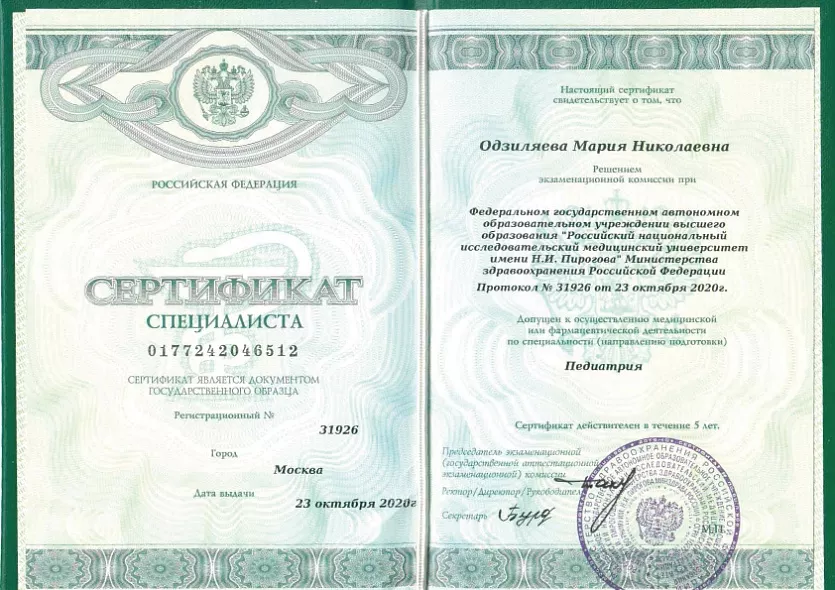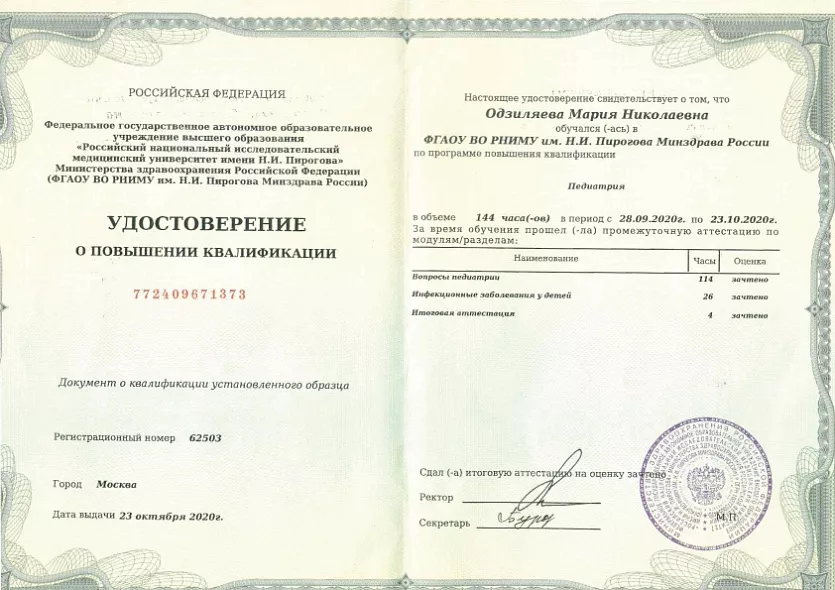• 2020: Российский национальный исследовательский медицинский университет имени Н.И. Пирогова, Факультет усовершенствования врачей, Педиатрия