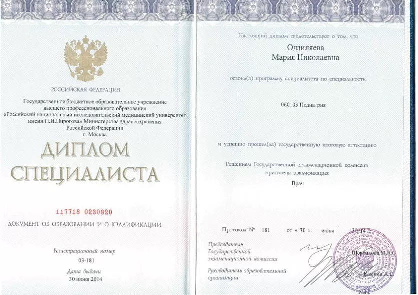 • 2014: Российский национальный исследовательский медицинский университет имени Н.И. Пирогова, Педиатрический факультет, Педиатрия