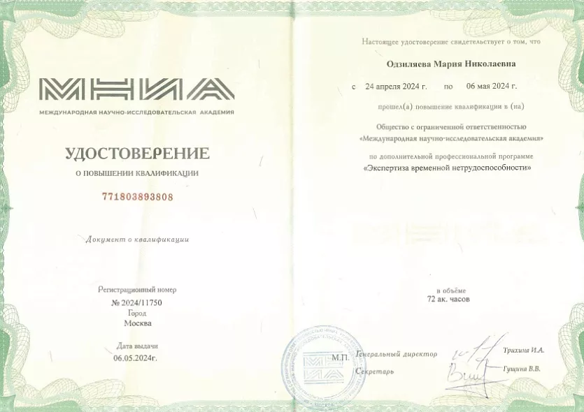 • 2024: Международная научно-исследовательская академия, Организация здравоохранения и общественное здоровье, Экспертиза временной нетрудоспособности
