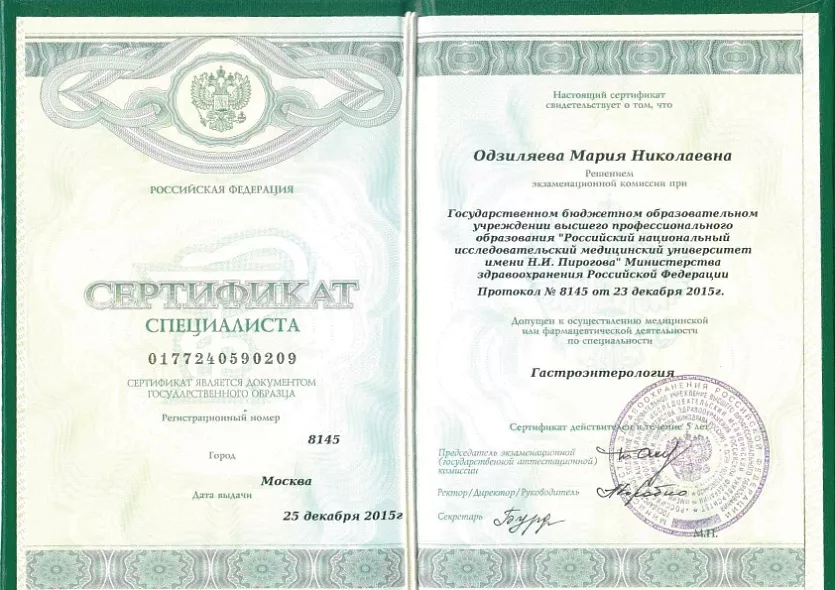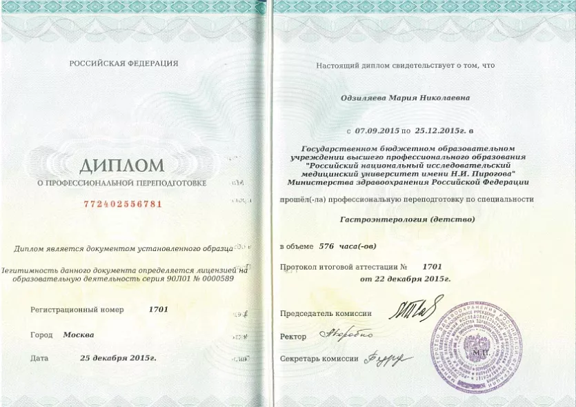 • 2015: Российский национальный исследовательский медицинский университет имени Н.И. Пирогова, Факультет усовершенствования врачей, Гастроэнтерология