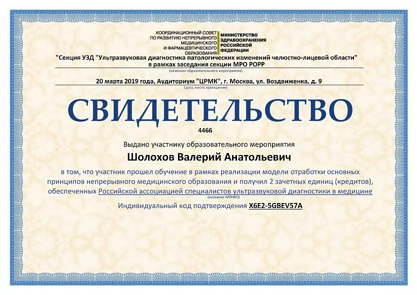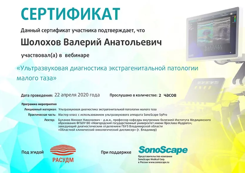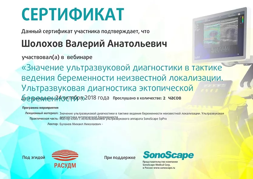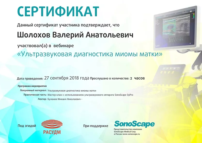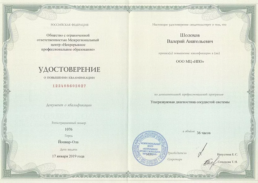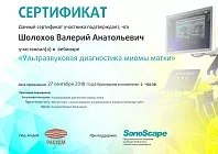 - 2018: ЧПУ ДПО «Региональная академия делового образования» г. Тольятти, «Ультразвуковая диагностика в акушерстве и гинекологии»